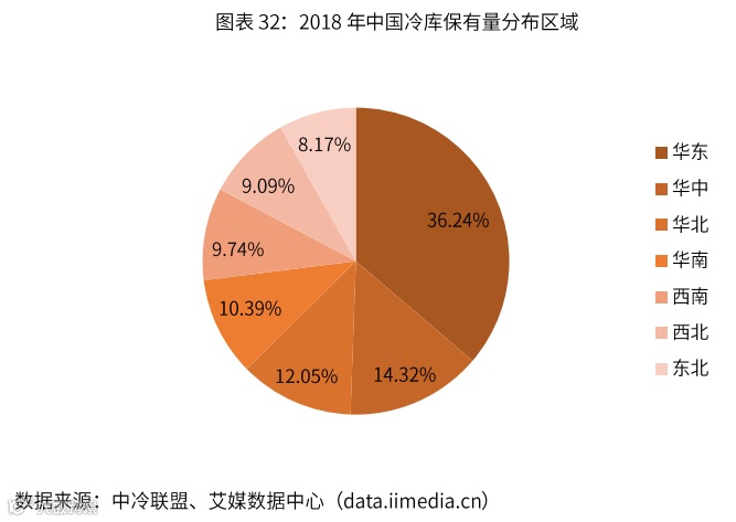 根据统计,中国华东区域的冷库保有量最大,2018年合计达1898万吨,占比超过36% 。我国冷库的整体建设发展失衡,主要分布在北京、上海等一线城市,而西北片区等内陆城市的分布相对较少。