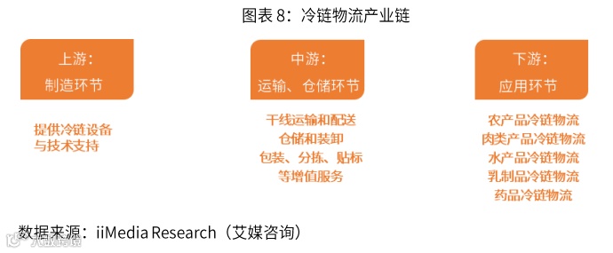 冷链是指配备专门设施、设备的,能够始终维持产品品质所需低温环境的,由生产、贮藏、运输、销售、配送到消费前各环节组成的低温保障系统。冷链物流可以在生鲜农产品的加工、运输、储藏等过程中保持低温,以保证质量,减少损耗。同时,冷链物流还可以应用于医药领域,保证疫苗、生物制剂、精密医疗仪器等对有温度要求的医药产品的运输质量。