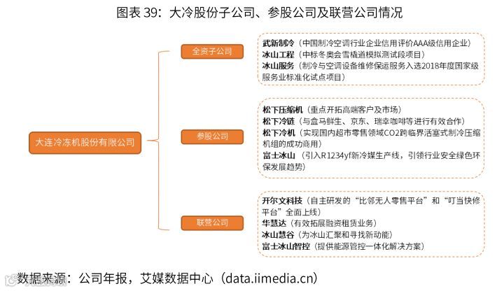 大冷股份的全资子公司有武新制冷、冰山工程、冰山服务;参股公司有松下压缩机、松下冷链、松下冷机,由日本三洋电机株式会社与大冷股份共同出资;联营的公司有开尔文科技、华慧达、冰山慧谷及富士冰山智控。