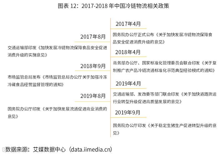 2017年4月,国务院办公厅正式公布《关于加快发展冷链物流保障食品安全促进消费升级的意见》,提出要加快完善冷链物流标准和服务规范体系,部署推动冷链物流行业健康发展的八项措施:一是健全冷链物流标准和服务规范体系,二是完善冷链物流基础设施网络,三是鼓励冷链物流企业经营创新, 四是提升冷链物流信息化水平, 五是加快冷链物流技术装备创新和应用,六是加大行业监管力度,七是创新管理体制机制, 八是完善政策支持体系。