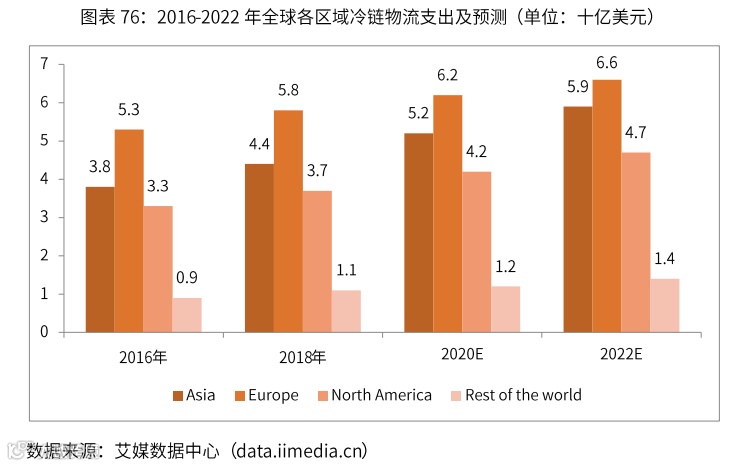 总体来看,欧洲冷链物流产业最为发达,2018年冷链支出达到58亿美元,亚洲、北美分别为44亿美元、37亿美元。预计到2022年,三个地区的冷链支出将分别达到66亿美元、59亿美元及47亿美元。