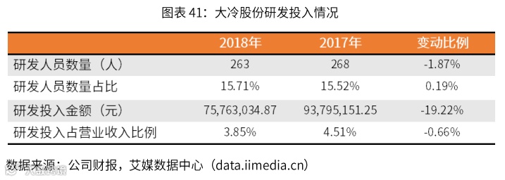 2018年全年,大冷股份研发人员共263位,相比2017年减少了5位,但研发人员占比增大。研发投入金额达7576.3万元,同比减少了19.22%,研发投入不足。作为技术主导型企业,研发投入是其技术提升的保证,若要在市场上保持自身竞争力,大冷股份仍需要加大研发投入力度。