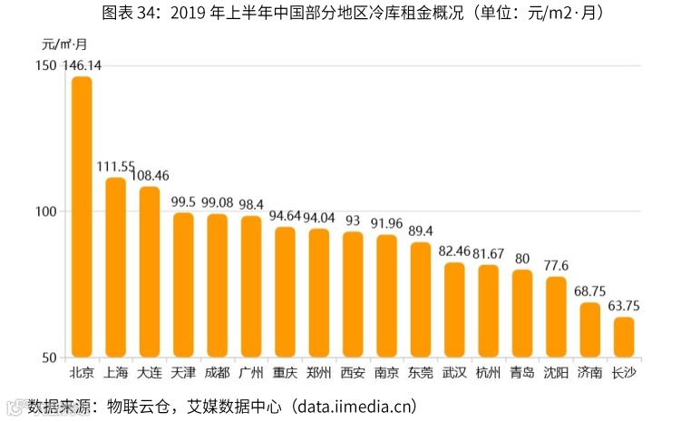 由于城市发展水平不同,冷库的地区租金差异较大,呈现东高西低、沿海地区高,内陆地区低的态势。其中,北京、上海、大连地区冷库平均租金均高于100元/㎡·月;长沙,济南地区冷库平均租金较低,均低于70元/㎡·月。
