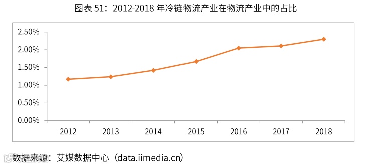 冷链物流产业在物流产业中的占比不断提高,估计2018年占比达到2.30%,未来将会进一步提高。