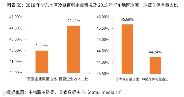 2015年,华东地区冷库及冷藏车保有量占比分别为45.68%及44.24%,2018年上半年,华东地区冷藏车数量增长占比为35%,在冷链物流设备上有一定的优势。