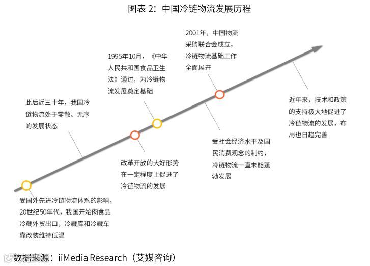 中国的冷链物流产业主要集中于食品冷链物流领域,最早产生于20世纪50年代的肉食品外贸出口。由于当时社会经济水平落后,冷藏库和冷藏车仅靠改装来维持低温。2001年中国物流采购联合会成立后,冷链物流基础工作全面展开,如冷链物流标准化建设,冷链物流信息化建设,冷链物流科学与技术工程,冷链物流理论研究及冷链物流也总体规划等,使我国冷链物流企业更为国际化、规范化。同时,随着我国社会经济的快速发展,居民消费水平不断提高以及人们对食品质量和安全性的要求的提高,推动了中国冷链物流行业的不断发展。