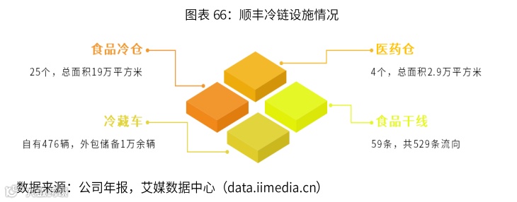 2019年,顺丰冷运有食品冷仓25个,总面积达19万平米,4个GSP认证医药仓,总面积达2.9万平方米,自由食品冷藏车476辆,外包储备冷藏车1万余辆,食品干线59条,共529条流向,贯通东北、华北、华东、华南、华中核心城市,同时高精端技术与顺丰冷链网络无缝对接,提供专业、高效运输服务。