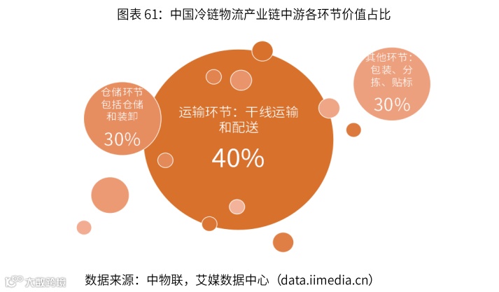 在中国冷链物流行业的价值链条方面,中游行业由运输环节(包括干线运输和配送)、仓储环节(包括仓储和装卸)以及其他环节(包装、分拣、贴标等增值服务)构成,其中运输环节所产生的价值最高,约占整个产业价值的40%,仓储环节和其他环节平分秋色,各占价值链条的30%。