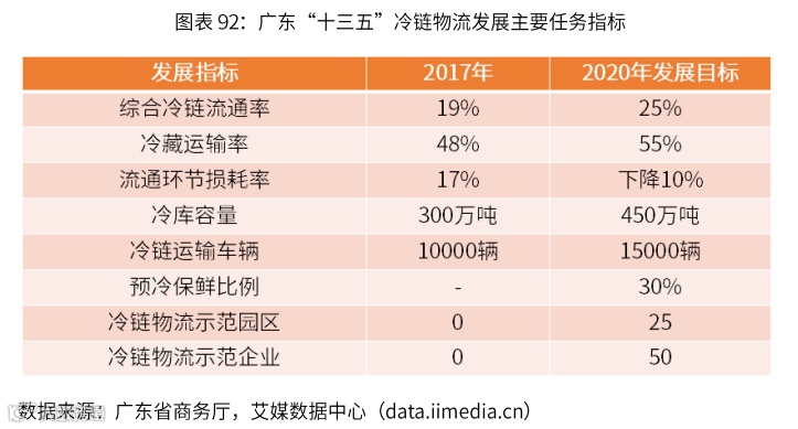 除了铁路网络外,“十三五”期间也同时大力发展其它配套设施的建设。以广东省为例,根据《广东省冷链物流发展“十三五”规划》,“十三五”期末冷链物流业降本增效,全省冷链流通率将达到25%,冷藏运输率达到55%,流通环节损耗率下降10%;完善冷链物流设施,全省冷库容量达到450万吨,冷链运输车辆达到15000辆,预冷保鲜比例达到30%;培育和认定冷链物流示范园区25个,示范企业50个。随着京津冀一体化、大湾区建设和海南等更多自贸区的开放,区域升级必将会在冷链基础设施建设、城市冷链配套服务等方面产生很多新机遇。