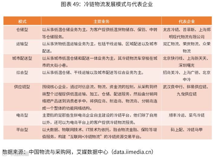 而冷链物流发展模式,目前我国存在7种,包括仓储型,综合型,城市配送型,综合型,供应链型,电商型及平台型。