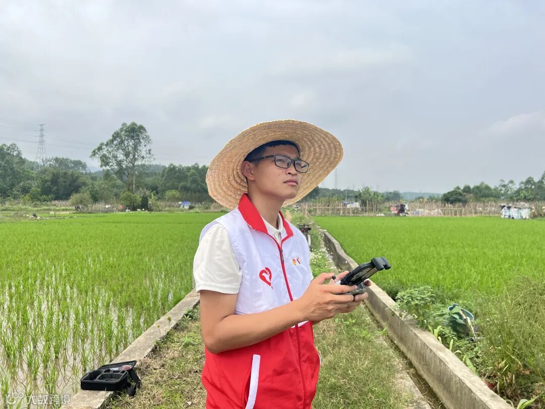 2023年4月,在肇庆高要莲塘镇,梁志鹏在田间地头使用无人机拍摄视频素材