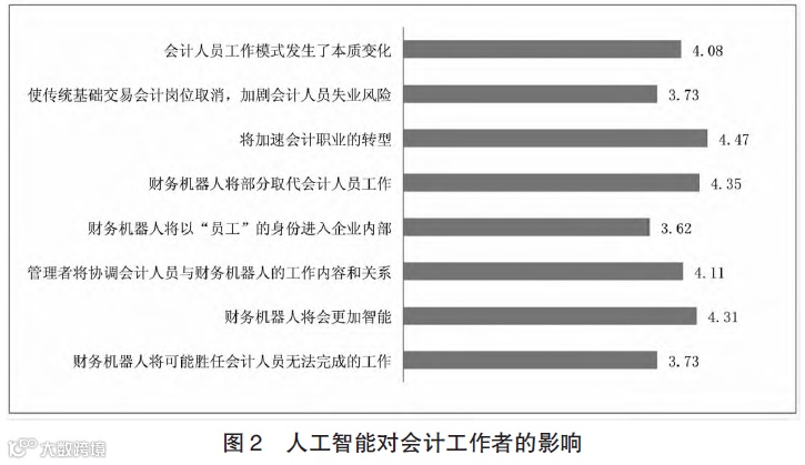 均分为4.05 分。在对会计工作者的具体影响上,如图2 所示,人工智能将加速会计职业的转型得分最高(4.47)。同时,调