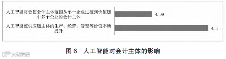 分为4.20 分,整体得分较高。在对会计主体的具体影响上,如图6 所示,调查问卷对象普遍认为人工智能使供应链主体的生产、经营、管理等价值不断提升(4.3),也较认同人工智能将会使会计主体范围从单一企业过渡到价值链中多个企业的会计主体(4.09)。这说明人工智能无论对于单个会计主体还是多个会计主体间的价值整合均有较大的积极影响。