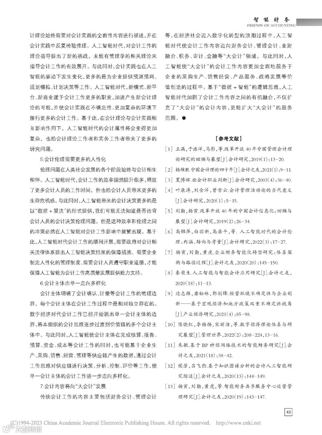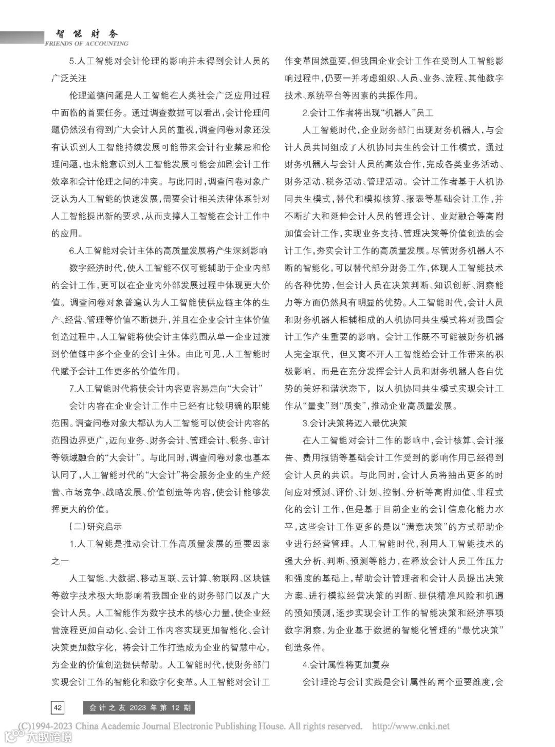 发展,使会计工作内容向财务会计、管理会计、税务、审计、金融等“大会计”领域融合,并将会计工作深入供应链的各个方面;与此同时,会计工作者出现了“机器人”员工,在利用会计技术性的基础上,使会计决策加速迈入最优决策,并开始考虑人工智能伦理对会计工作的影响。上述研究为我国人工智能在会计工作中的应用提供经验证据和对策建议。