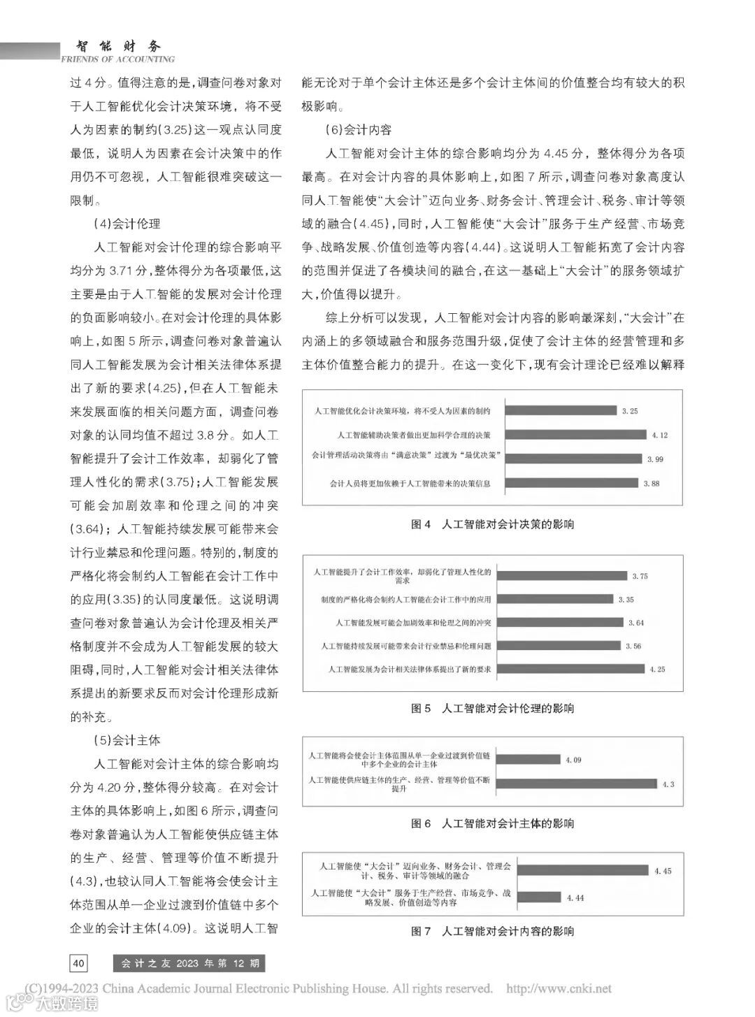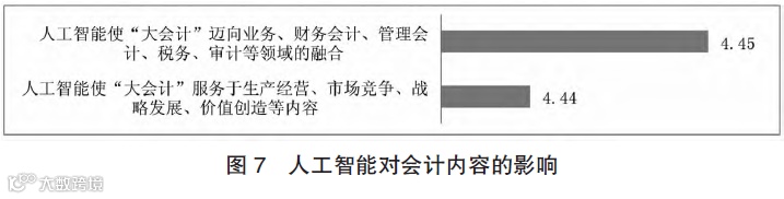最高。在对会计内容的具体影响上,如图7 所示,调查问卷对象高度认同人工智能使“大会计”迈向业务、财务会计、管理会计、税务、审计等领域的融合(4.45),同时,人工智能使“大会计”服务于生产经营、市场竞争、战略发展、价值创造等内容(4.44)。这说明人工智能拓宽了会计内容的范围并促进了各模块间的融合,在这一基础上“大会计”的服务领域扩大,价值得以提升。