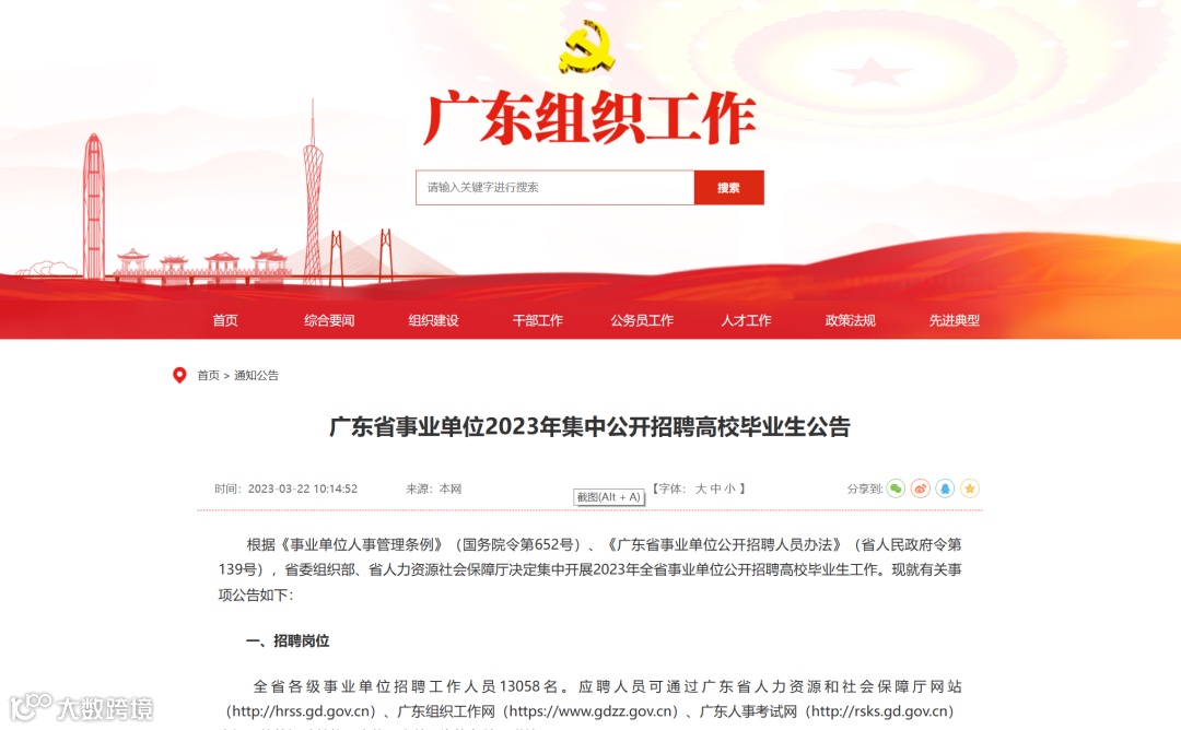 根据《事业单位人事管理条例》(国务院令第652号)、《广东省事业单位公开招聘人员办法》(省人民政府令第139号),省委组织部、省人力资源社会保障厅决定集中开展2023年全省事业单位公开招聘高校毕业生工作。现就有关事项公告如下: