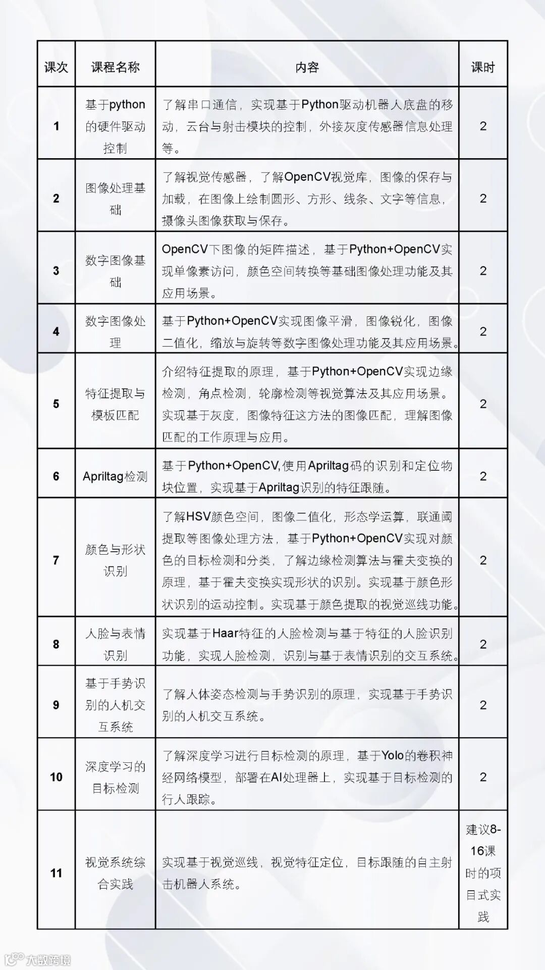 围绕机器人射击格斗场景,设计了详尽的机器视觉+人工智能实验教程,是开展相关实践课程的理想平台。支持中国高校智能机器人创意大赛和中国智能机器人格斗及竞技大赛的4个赛项,课程以竞赛项目作为出口,真正做到以赛促学、以学助赛,高效地达成赛课结合的教育目标。