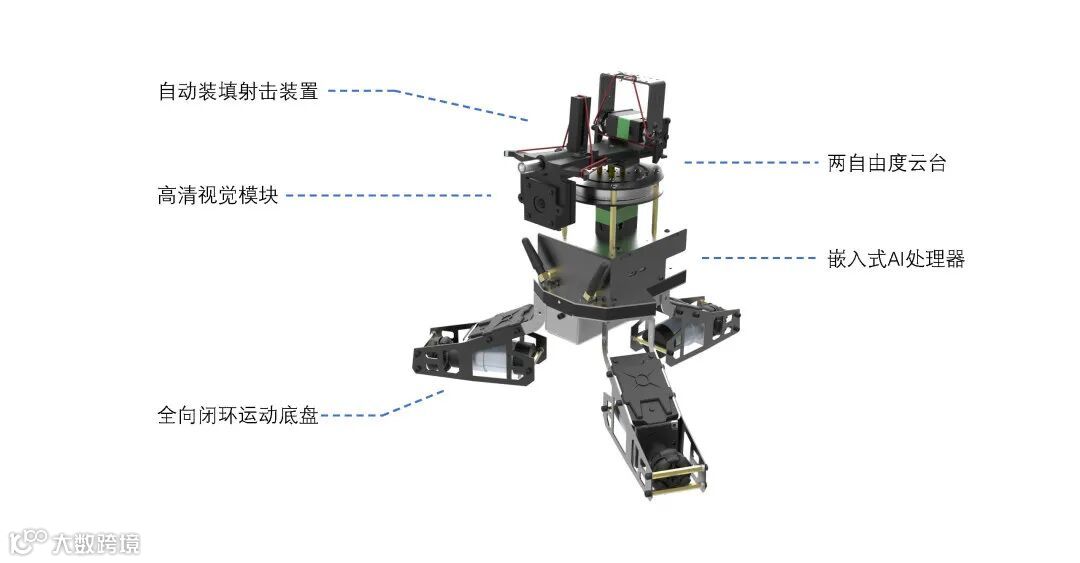 采用模块化设计,主体由3轮全向底盘和搭载射击模块的双自由度云台构成,配置AI处理器与高清摄像头,模块均可拆卸,接口独立清晰。底盘与云台均可通过Python的接口独立控制,灵活应对不同的竞赛场景。