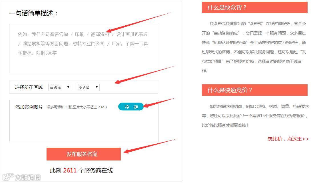 进入快竞网首页,点击“服务商”,选择商家,点击“咨询商家”,在线咨询问题。或者直接点击“快众帮”,一句话简单发布你的问题。等商家联系你。一般很快就会有商家或者直接的厂家在线解答你的疑问。