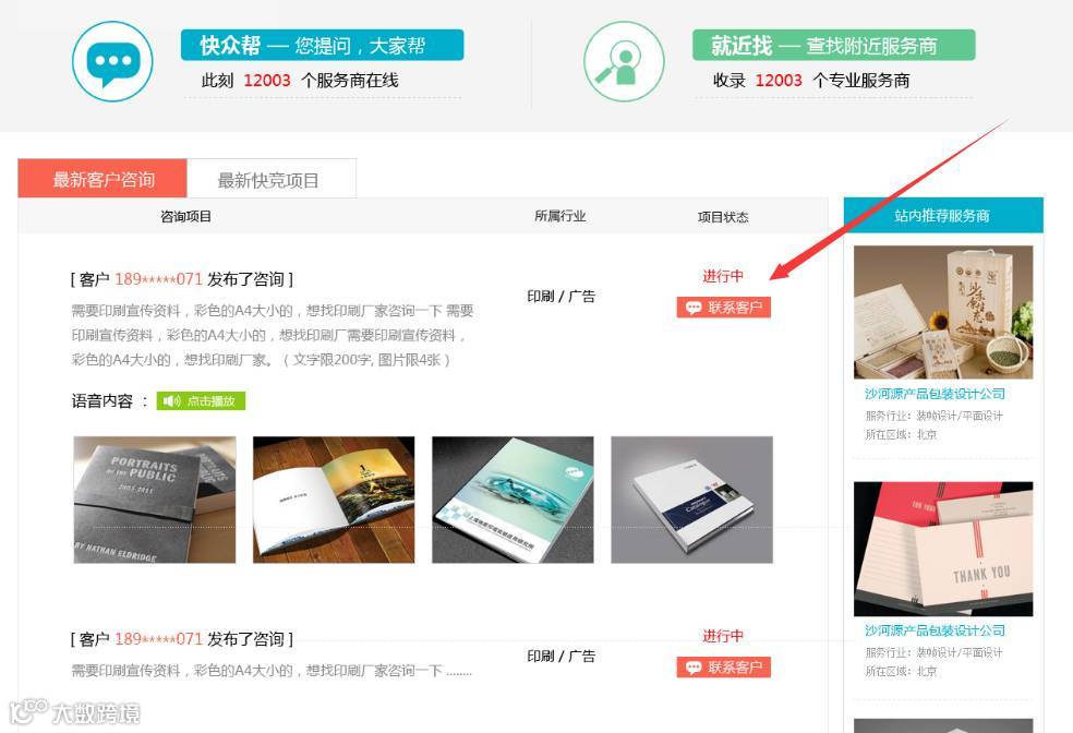 网上搜索“快竞网”或输入网址 www.91kuaijing.com ,进入“业务市场”,查看“最新客户咨询”。可以看到客户咨询的问题,点击“联系客户”,直接与有需求的客户在线沟通。以达成合作。