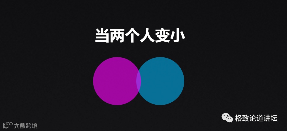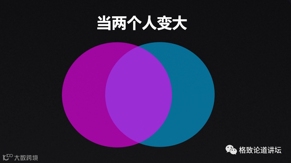 圆代表两个不同的人,他们遇到了一起。我用圆心来代表两个人之间的某种距离,这个距离往往是一些相似性。大量的研究发现,相似的人比互补的人在一起更可能幸福。因为当两个人不同的时候,我们要付出更多的精力去沟通、协调,这对很多人来说是一个挑战。