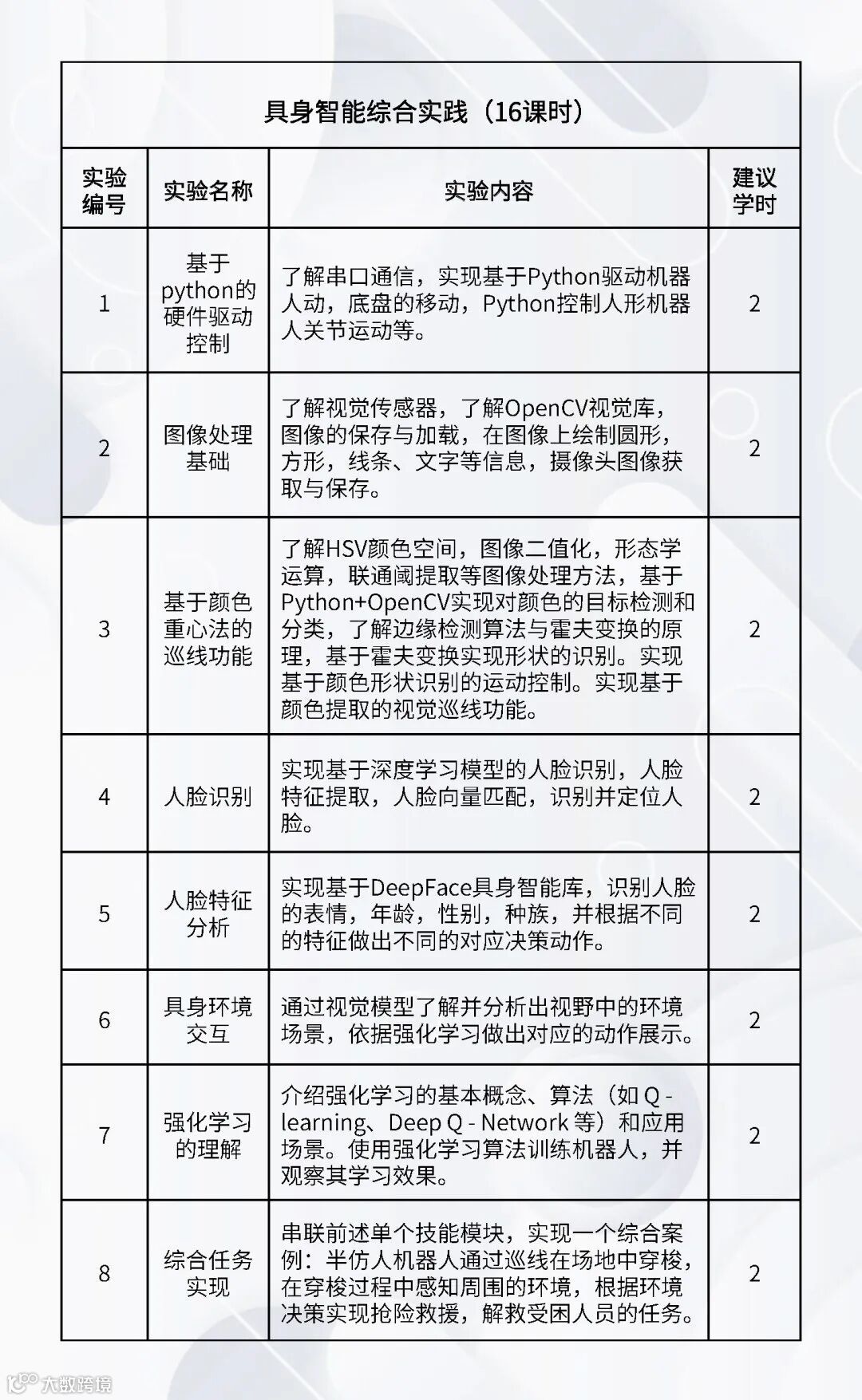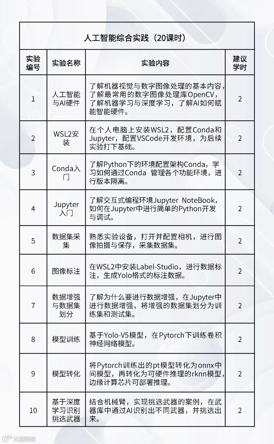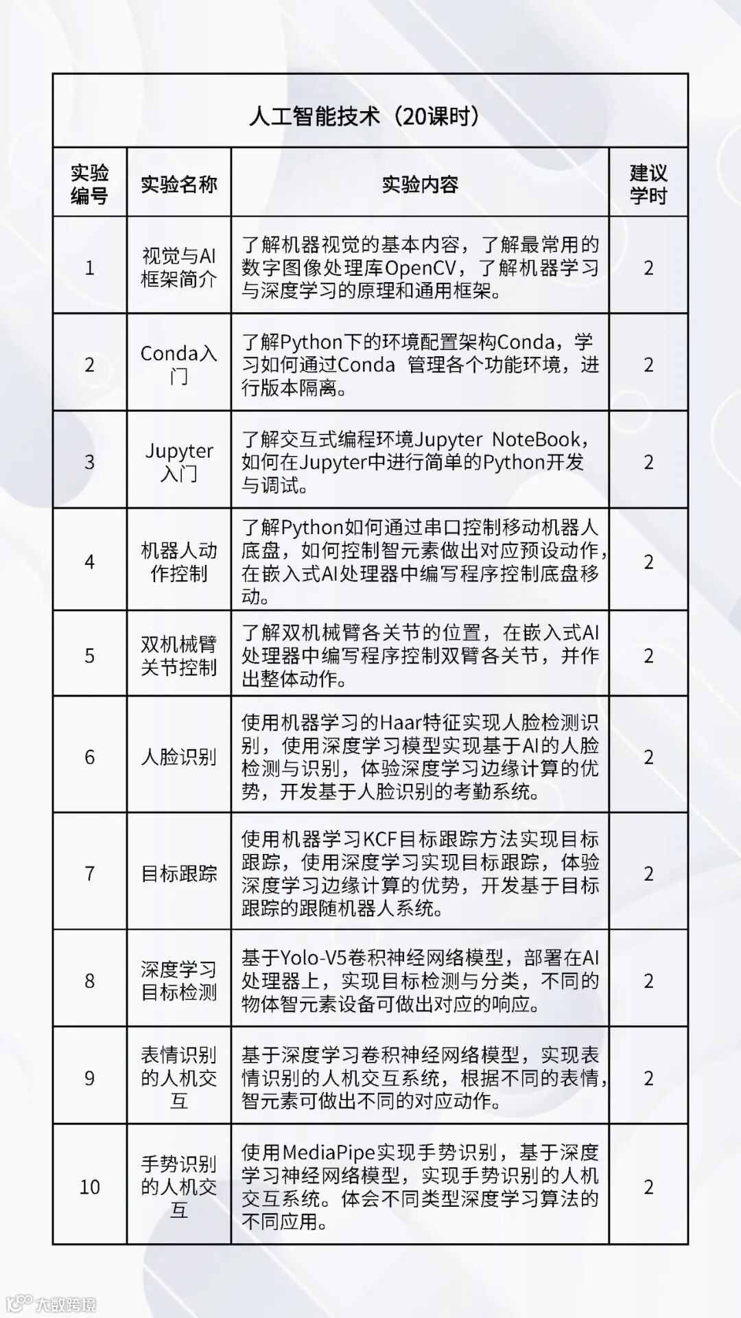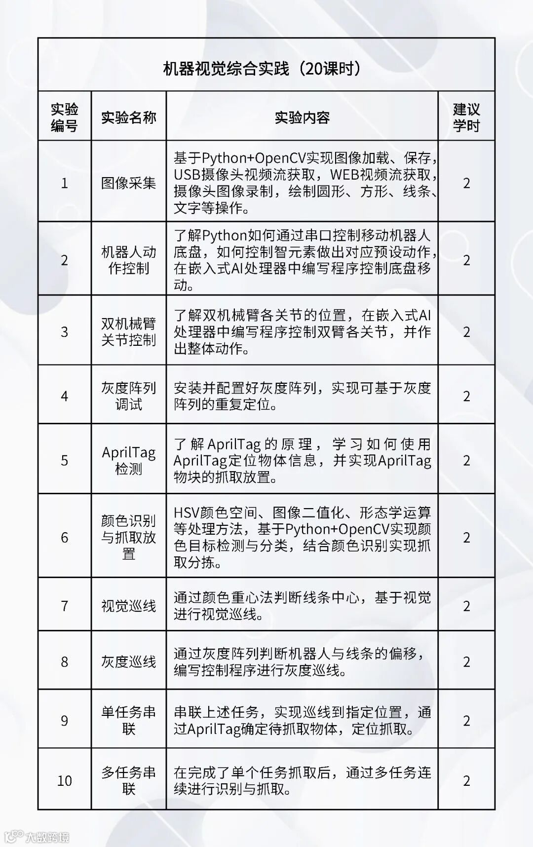 配套的实验课程:《机器视觉与AI》、《机器视觉综合实践》、《人工智能综合实践》、《具身智能综合实践》。