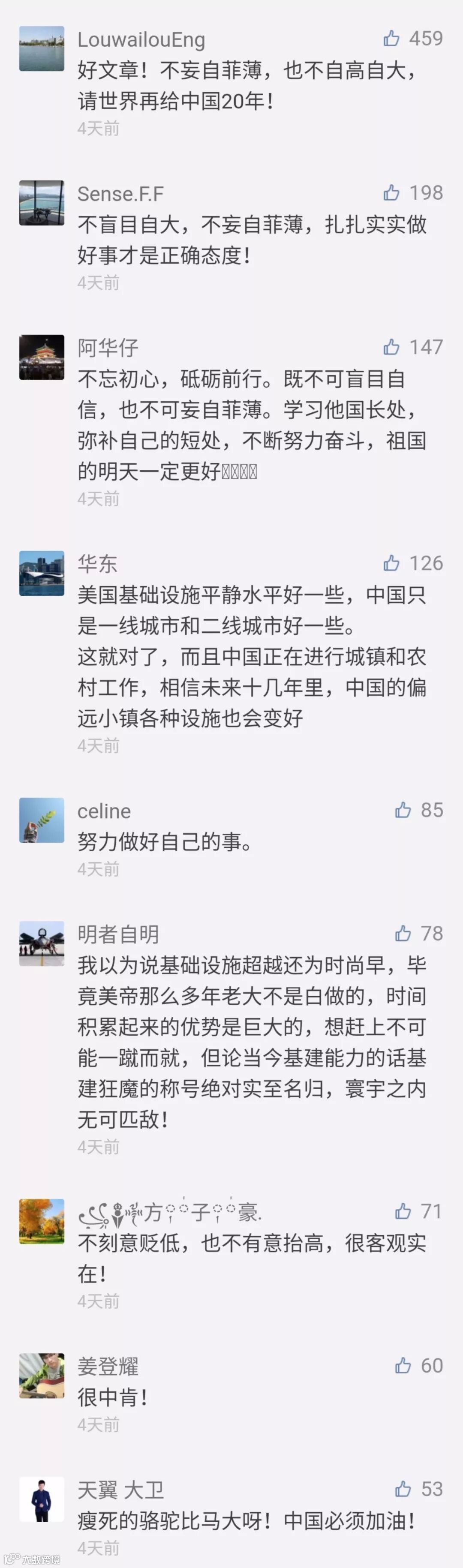 面对强大的参照物,我们不必自惭形秽,同时也不应该轻视对方。我们需要拥有比美国人更强烈的紧迫感、危机感,苦干实干,练好我们基础设施建设的“内功”。