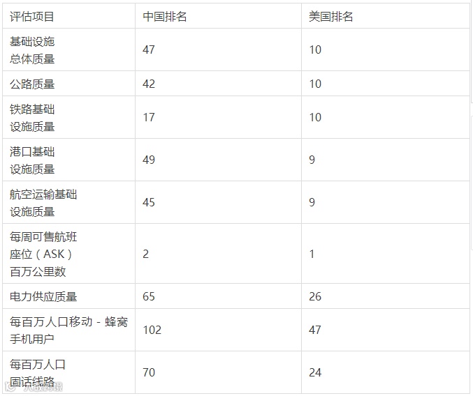 在基础设施竞争力评估中,美国名列世界第九,得分6.0,中国则名列第46,得分4.7。