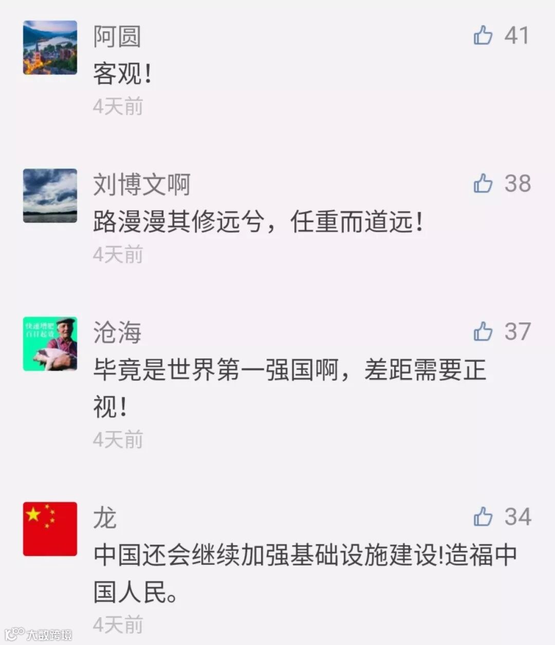 而关于中美在基础建设中的实力对比,也有网友表示: