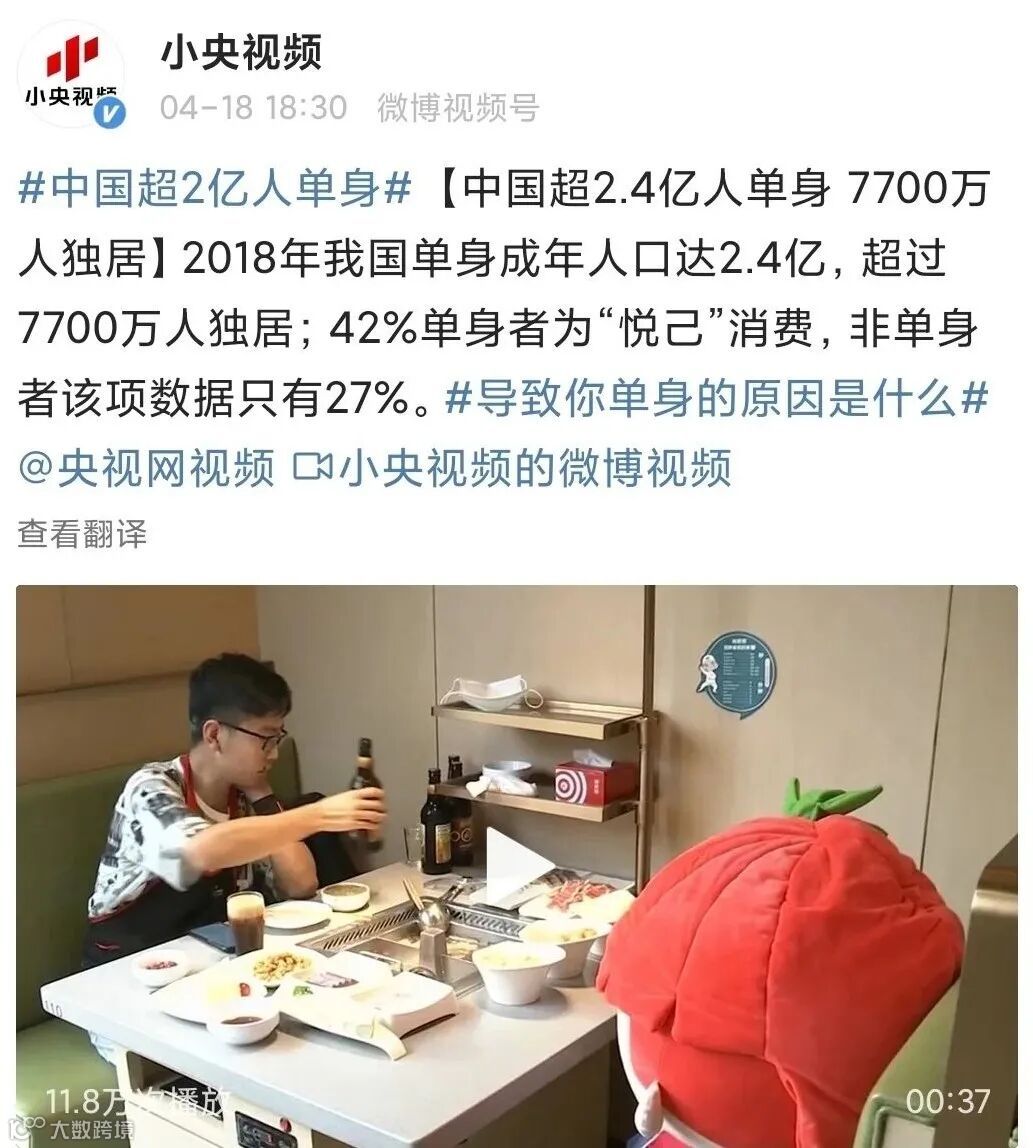前段时间#中国超2亿人单身#的话题也冲上了热搜,民政部数据显示,2018年我国单身成年人口达2.4亿,超过7700万人独居,预计到2021年,这一数字会上升到9200万人。