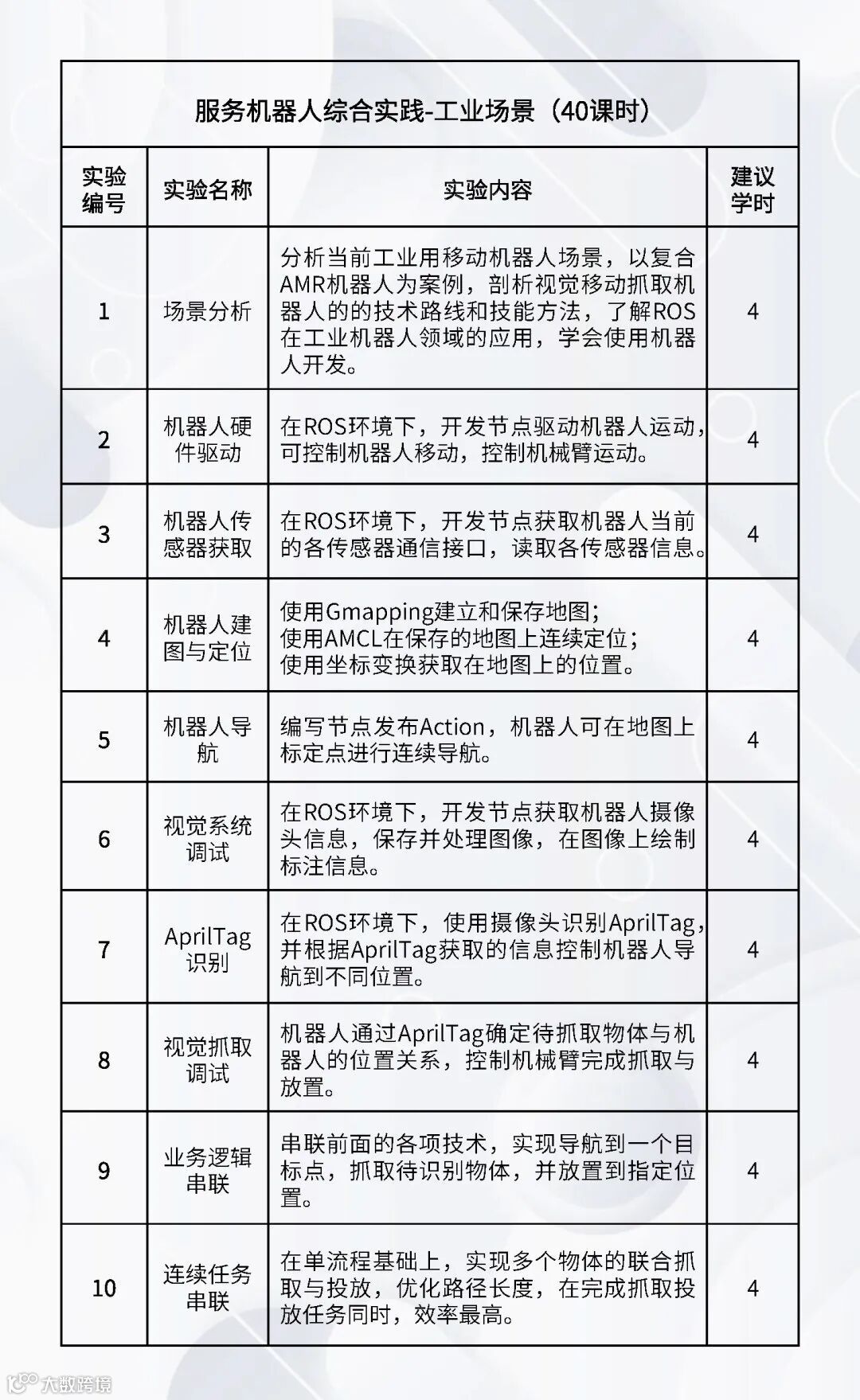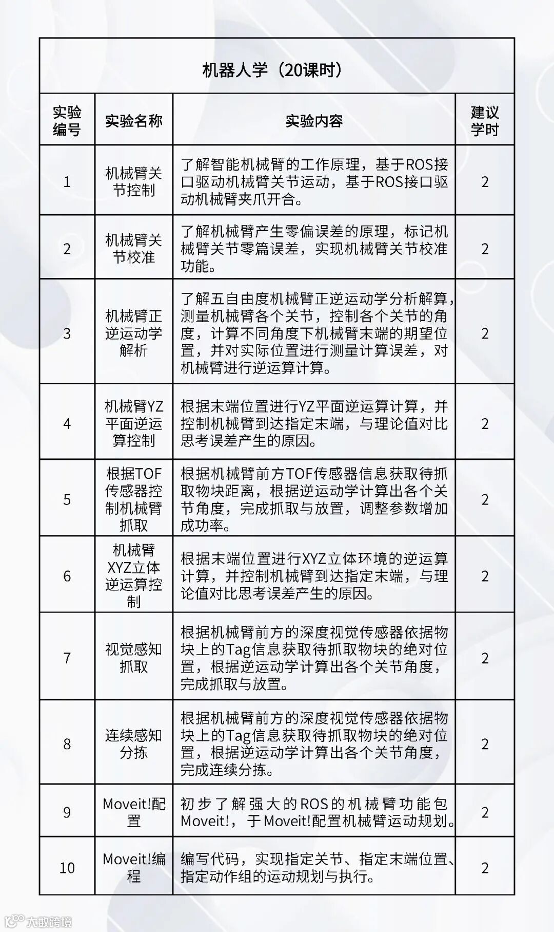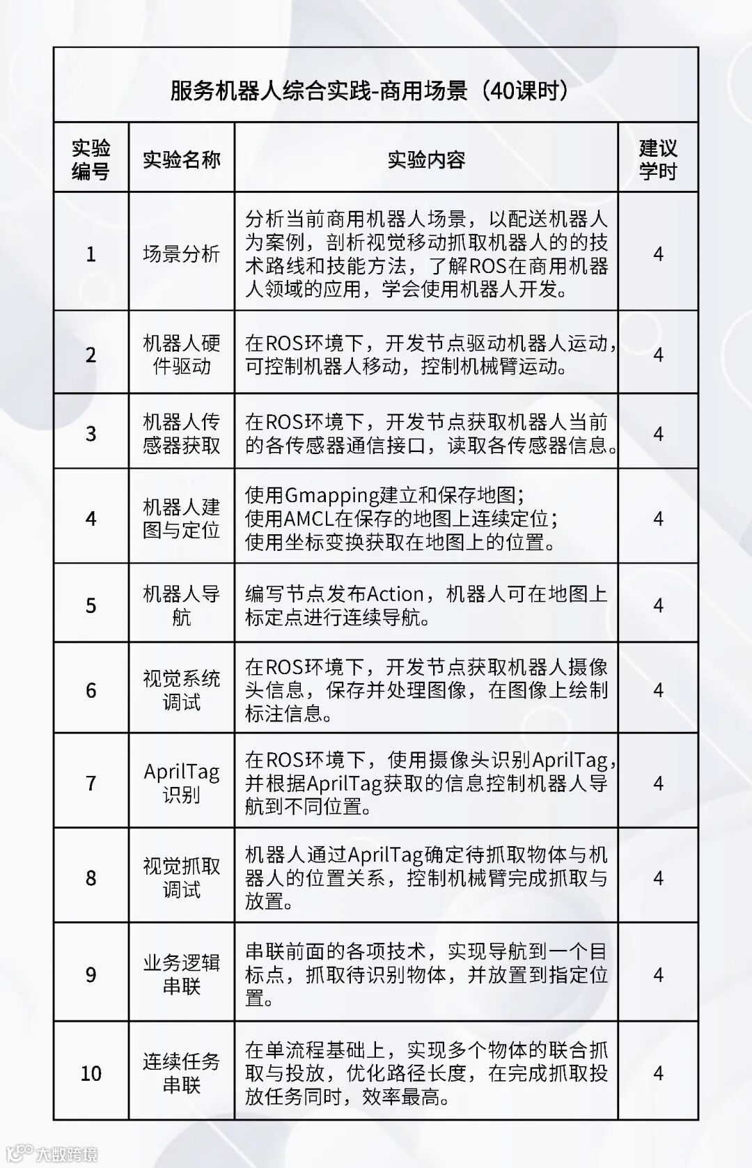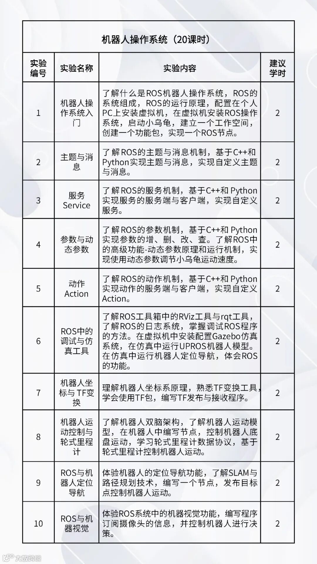 配套的实验课程:《嵌入式Linux操作系统》、《机器人编程(C++)》、《机器人编程(Python)》、《数字图像处理基础》、《机器人操作系统》、《机器人感知传感》、《机器视觉与AI》、《机器人学》、《机器人定位导航》、《机器人建模与仿真》、《语音大模型综合实践》、《具身智能综合实践》、《服务机器人综合实践(家用场景)》、《服务机器人综合实践(商业场景)》、《服务机器人综合实践(工业场景)》、《智能机器人建模仿真综合实践》。