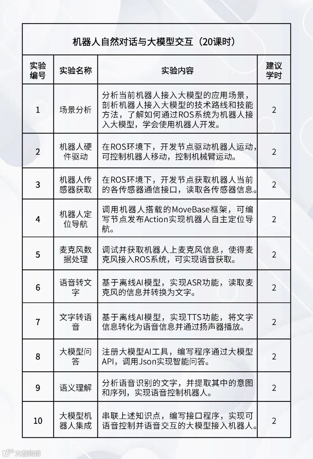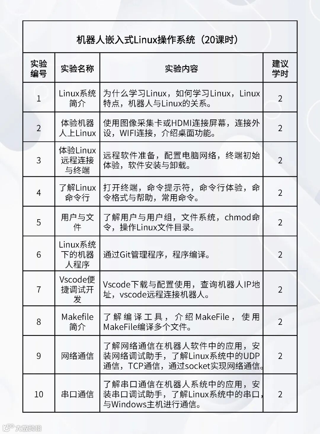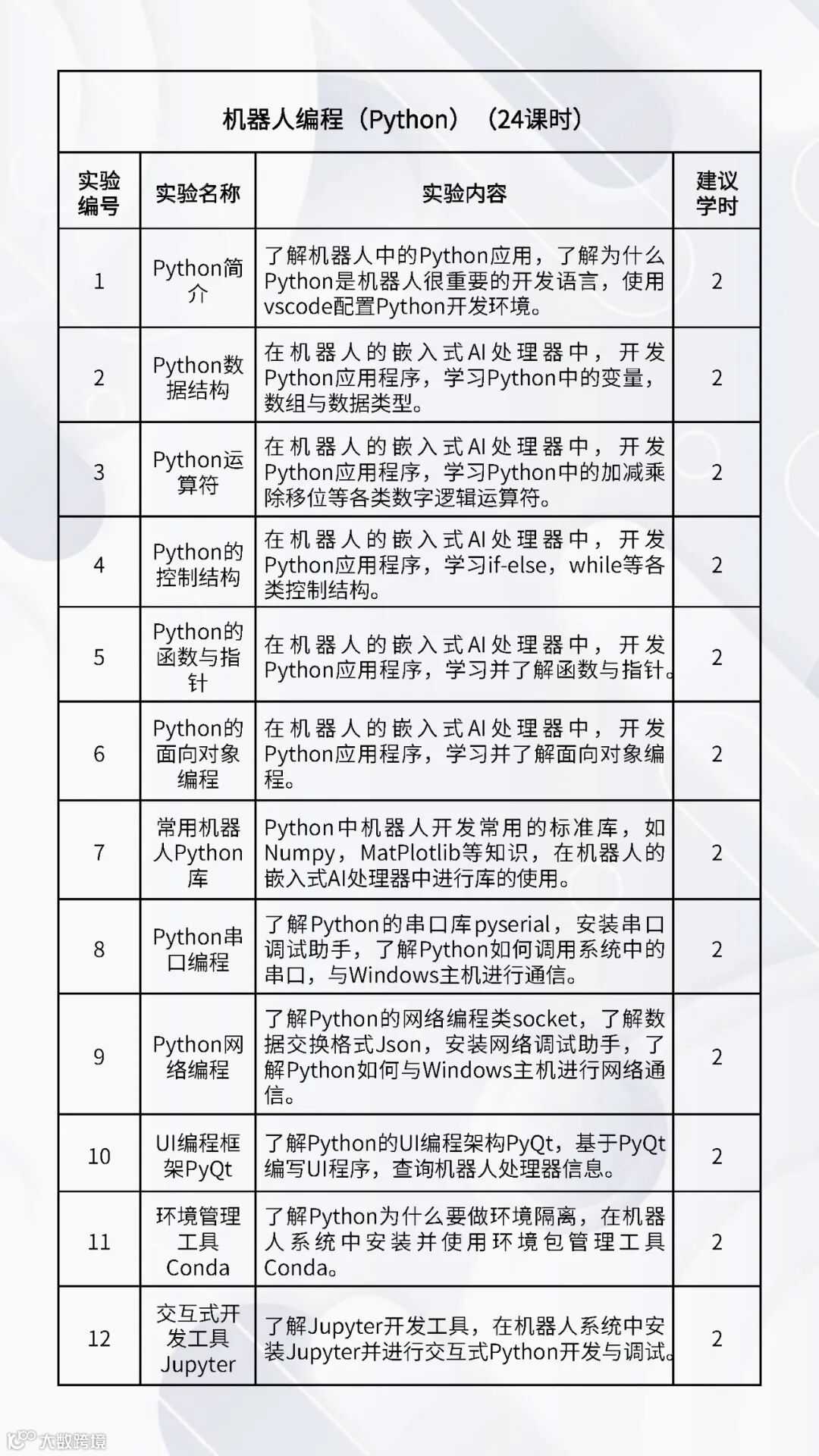配套的实验课程:《嵌入式Linux操作系统》、《机器人编程(C++)》、《机器人编程(Python)》、《数字图像处理基础》、《机器人操作系统》、《机器人感知传感》、《机器视觉与AI》、《机器人学》、《机器人定位导航》、《机器人建模与仿真》、《语音大模型综合实践》、《具身智能综合实践》、《服务机器人综合实践(家用场景)》、《服务机器人综合实践(商业场景)》、《服务机器人综合实践(工业场景)》、《智能机器人建模仿真综合实践》。