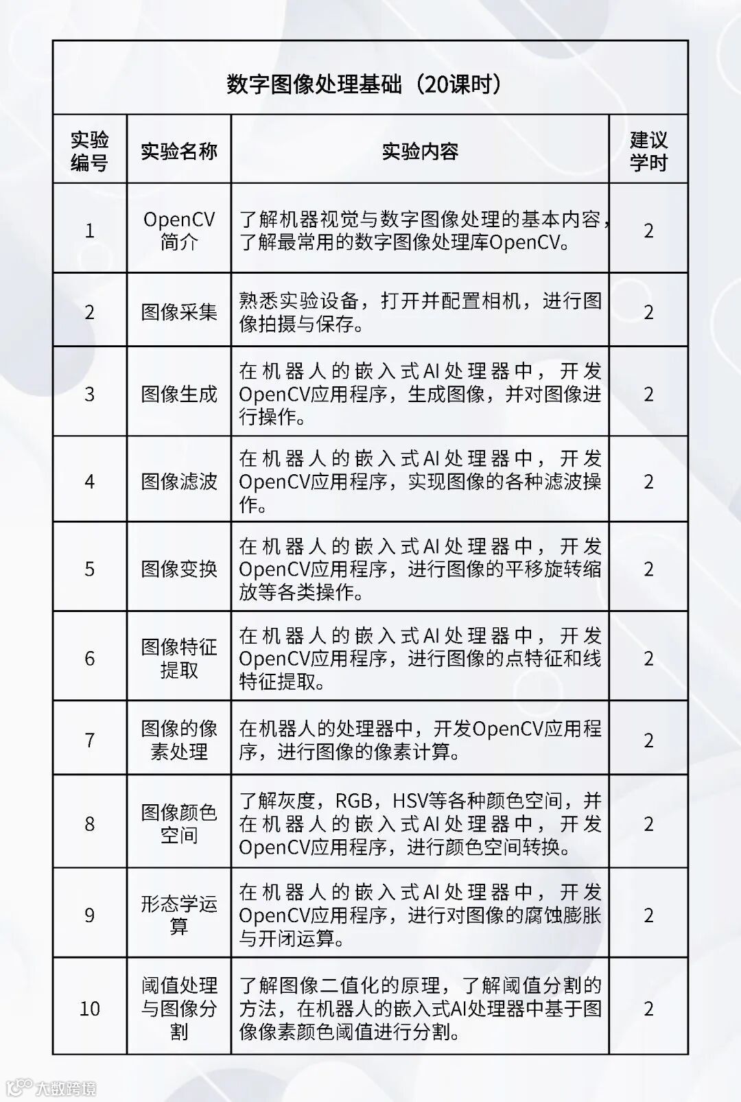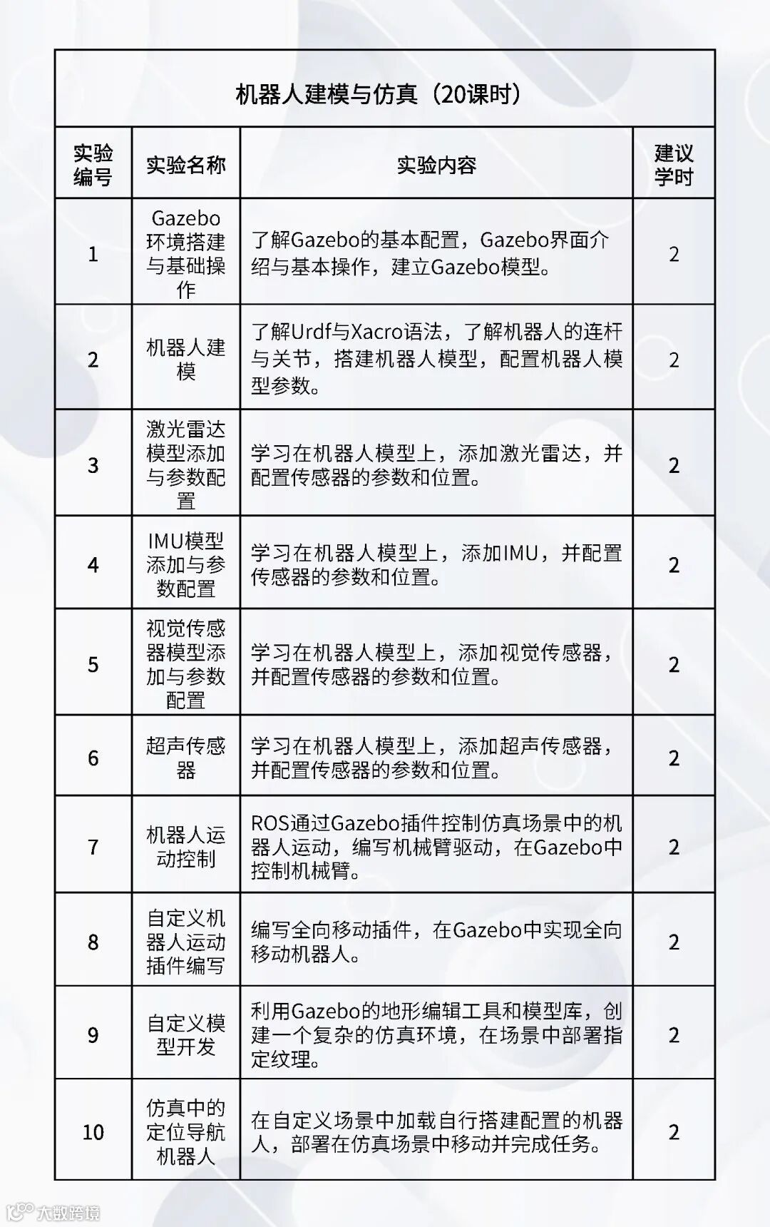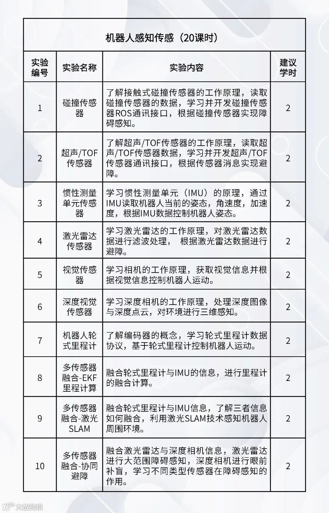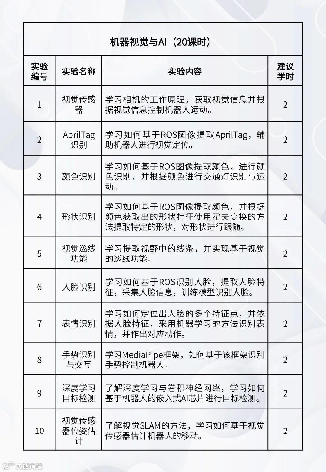 配套的实验课程:《嵌入式Linux操作系统》、《机器人编程(C++)》、《机器人编程(Python)》、《数字图像处理基础》、《机器人操作系统》、《机器人感知传感》、《机器视觉与AI》、《机器人学》、《机器人定位导航》、《机器人建模与仿真》、《语音大模型综合实践》、《具身智能综合实践》、《服务机器人综合实践(家用场景)》、《服务机器人综合实践(商业场景)》、《服务机器人综合实践(工业场景)》、《智能机器人建模仿真综合实践》。