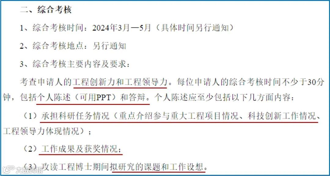 主要围绕网上报名时所提交的申请材料清单进行资格审核,围绕国家重大战略和关键领域人才需求,结合考生承担工程领域重大、重点项目的科研经历、重要科研成果和工作业绩,以及工程实践能力、学术水平和创新能力、专家推荐意见等方面。材料审核通过后方可进入综合考核阶段。