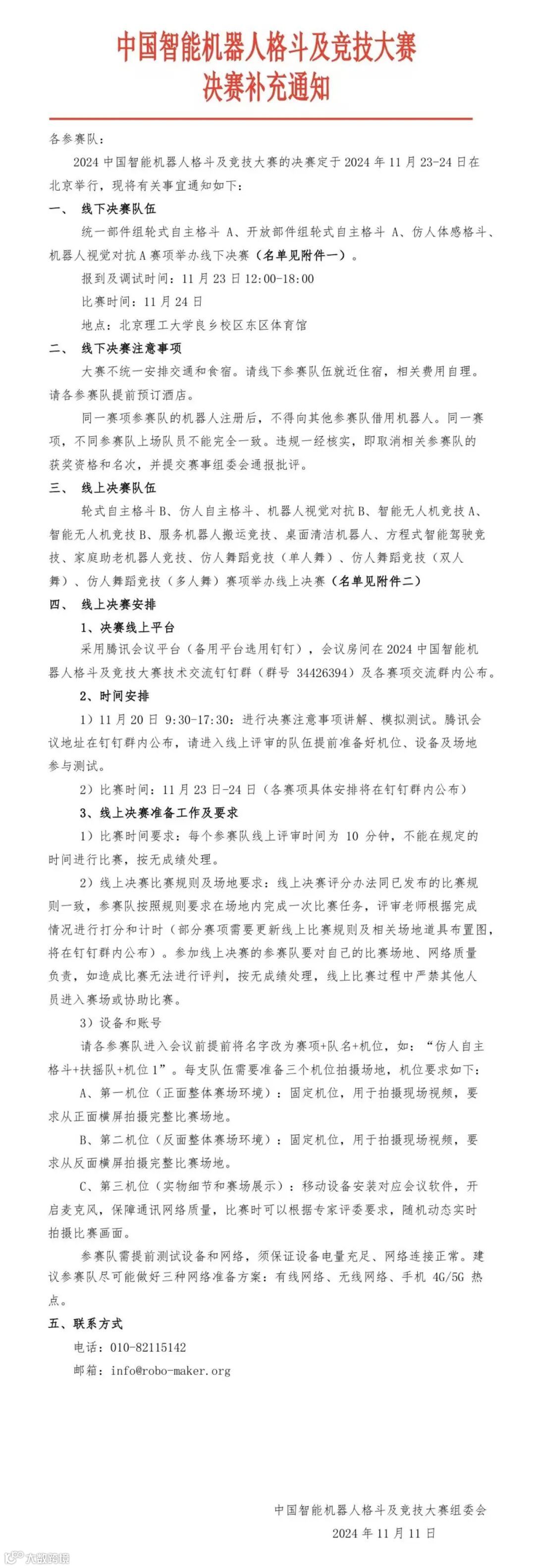 【赛事通知】2024中国智能机器人格斗及竞技大赛决赛补充通知