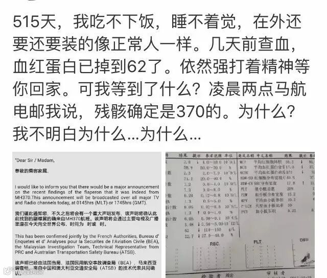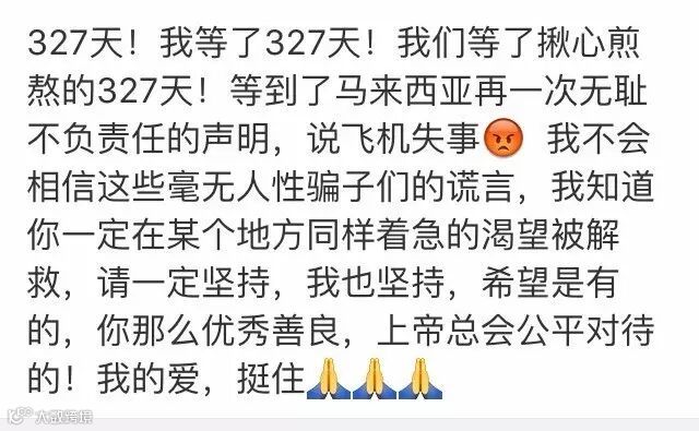 2017年3月8日,她的最新一次更新,一群马航失事人员家属举着纸板,上面写着:“不放弃”。