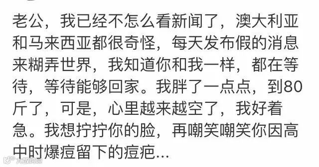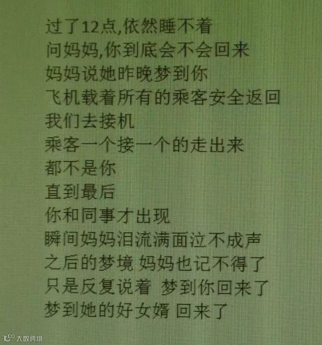 但她还是选择坚强,因为只要飞机的残骸没找到,她就相信,他还是会有回来的那一天。