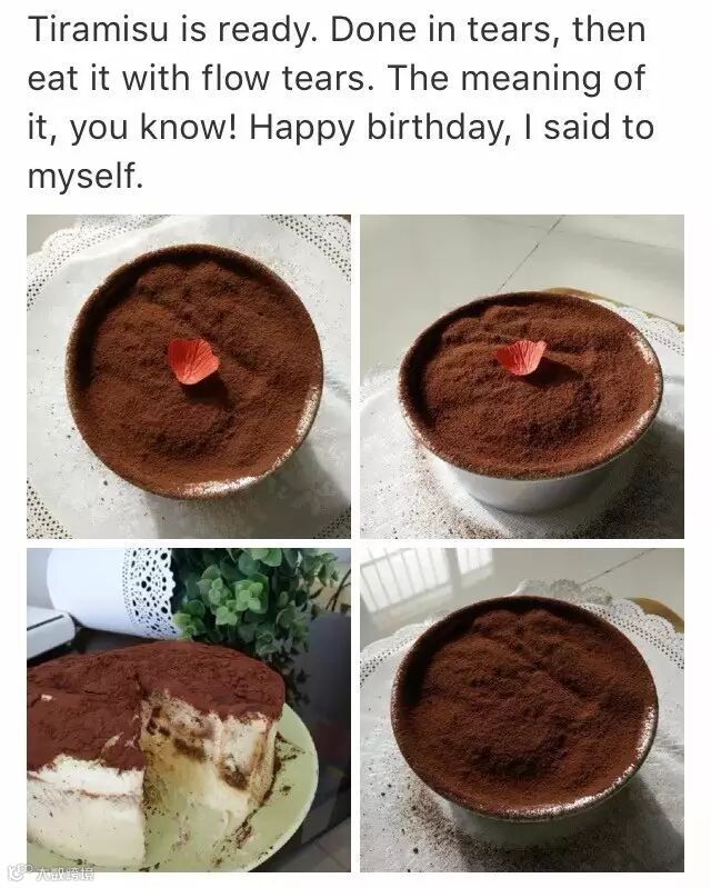 她在社交平台,远不止一次表达过离开了丈夫感觉无法活下去。她为他第一次学做了提拉米苏,其实,提拉米苏代表的含义是:“带我走”。
