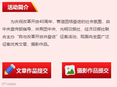 为庆祝改革开放40周年,营造团结奋进的社会氛围,由中央宣传部指导,共青团中央、光明日报社、经济日报社联合主办“我与改革开放共奋进”征集活动,现面向全国广泛征集优秀文章、摄影作品。