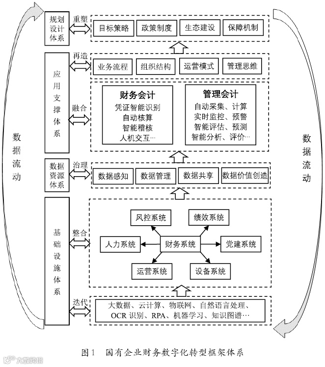 《中华人民共和国国民经济和社会发展第十四个五年规划和2035年远景目标纲要》提出,要“加快数字化发展,建设数字中国”“以数字化转型整体驱动生产方式、生活方式和治理方式变革”。中国信息通信研究院发布的《中国数字经济发展白皮书(2021)》显示,2020年我国数字经济规模达到39.2万亿元,增长9.7%,占GDP比重为38.6%,数字经济已经成为我国经济高质量发展的重要驱动力。目前,企业数字化转型逐步成为发展数字经济的主战场(张永珅等,2021)。2020年8月,国务院国资委发布了《关于加快推进国有企业数字化转型工作的通知》,明确了国有企业数字化转型的方向,积极引导国有企业顺应数字经济发展趋势,加快培育发展新动能。财务部门作为企业的数据处理中心,往往成为企业数字化转型的先行者,也是贯通企业全面数字化转型的中枢系统,财务数字化转型的实施成效决定了企业整体的数字化转型进程。