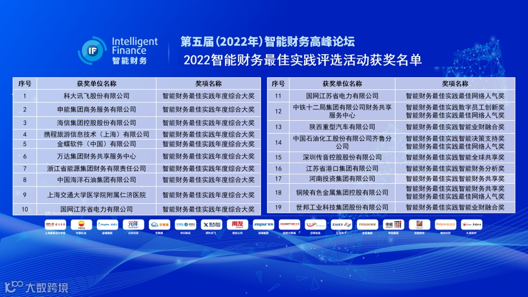 科大讯飞股份有限公司、申能集团商务服务有限公司、海信集团控股股份有限公司、携程旅游信息技术(上海)有限公司、金蝶软件(中国)有限公司、万达集团财务共享服务中心、浙江省能源集团财务有限责任公司、中国海洋石油集团有限公司、上海交通大学医学院附属仁济医院、国网江苏省电力有限公司获得智能财务最佳实践年度综合大奖;