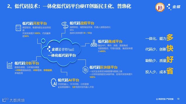 低代码技术:一体化低代码平台使IT创新民主化、普惠化。广义的低代码技术包括低代码开发、流程、集成、分析、AI和区块链平台。“一体化,能力多、代码少,创新快、缺陷少,质量好、投入少,成本省”是低代码技术带来的直观应用感受。数据收集一直是制约绩效管理的瓶颈。与传统的集成技术相比,低代码集成在环境的搭建、连接的配置、定义数据结构、字段自动映射及缩短、集成测试部署等环节大大节省了时间,使整个集成应用更加简单、快速和易运维。传统集成大约花费二百多分钟,低代码集成大约花费约50分钟,集成效率提升400%另一方面,原来的传统集成对人员的素质要求非常高,需要具备开发语言、开发框架、通信协议等方面的知识。低代码集成仅需要具有集成脚本数据的一般使用能力即可操作,大大降低门槛。