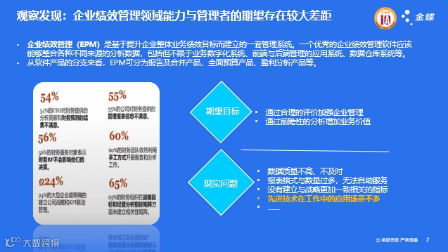 企业绩效管理(EPM)是基于提升企业整体业务绩效目标而建立的一套管理系统。一个优秀的企业绩效管理软件应该能够整合各种不同来源地分析数据,包括但不限于业务数字化系统、前端与后端管理的应用系统、数据仓库系统等。从软件产品的分支来看,EPM可分为报告及合并产品、全面预算产品、盈利分析产品等。企业对绩效管理的期望目标是通过合理的评价加强企业管理以及通过前瞻性的分析增加业务价值。但现实情况,大部分人对于企业绩效管理发挥的作用并不认同。原因主要集中在数据质量不高不及时、报表格式与数量过多,无法自助服务、没有建立与战略更加一致相关的指标以及先进技术在工作中的应用场景不多等。