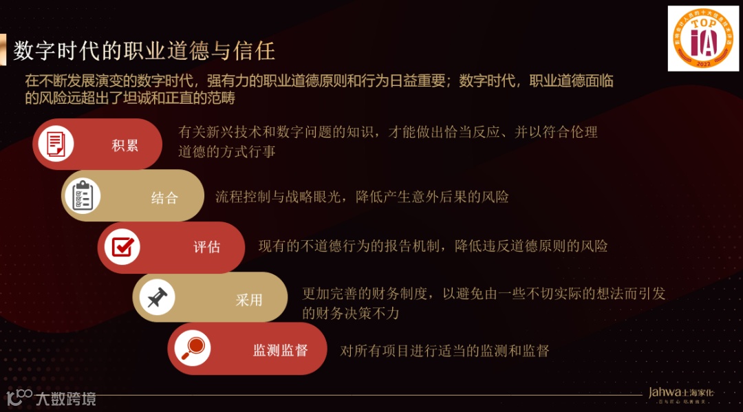 数字时代的职业道德与信任的相关问题,在不断发展演变的数字时代,强有力的职业道德原则和行为日益重要。数字时代,职业道德面临的风险远远超出了坦诚和正直的范畴。大数据时代需要有商业洞察力的员工。企业也需要及时采取相关措施进行调整,例如灌输有关新兴技术和数字问题的知识、完善现有的不道德行为的报告机制,降低违反道德原则的风险、建立更加完善的财务制度,以避免由一些不切实际的想法而引发的财务决策不力等。