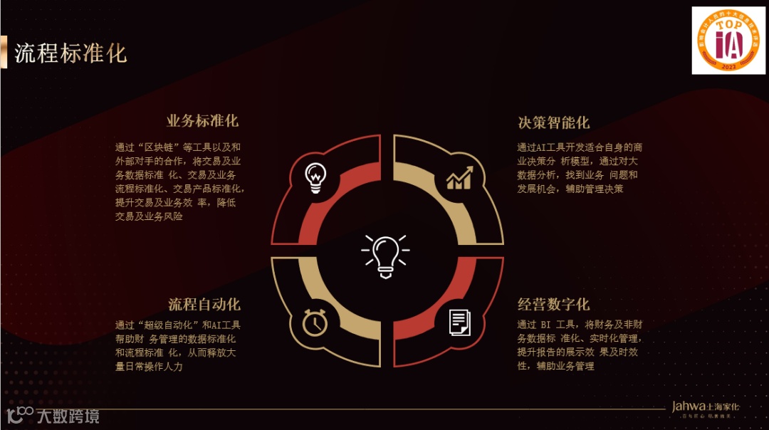 所有业务创新,都需要依托业务场景。所有业务场景,都离不开流程和数据。流程标准化与系统贯通是开发、使用系统的前提。流程标准化的目标是流程去手工、流程优化,具体包括:一是业务标准化。通过“区块链”等工具以及和外部对手的合作,将交易及业务数据标准化、交易及业务流程标准化、交易产品标准化,提升交易及业务效率,降低交易及业务风险。二是流程自动化。通过“超级自动化”和AI工具帮助财务管理数据标准化和流程标准化,从而释放大量日常操作人力。三是决策智能化。通过AI工具开发适合自身的商业决策分析模型。通过对大数据分析,找到业务问题和发展机会,辅助管理决策。四是经营数字化。通过BI工具,将财务及非财务数据标准化、实时化管理,提升报告的展示效果及时效性,辅助业务管理。数据质量提升与系统升级方面,通过系统升级,实现跨层级、跨部门、跨系统数据互联互通,实现对业务、费用的管理、监控、分析、预测,其中系统架构搭建最为关键。数据质量提升方面,通过主数据管理和数据中台技术,促进企业内数据质量优化、数据资产化和服务化。