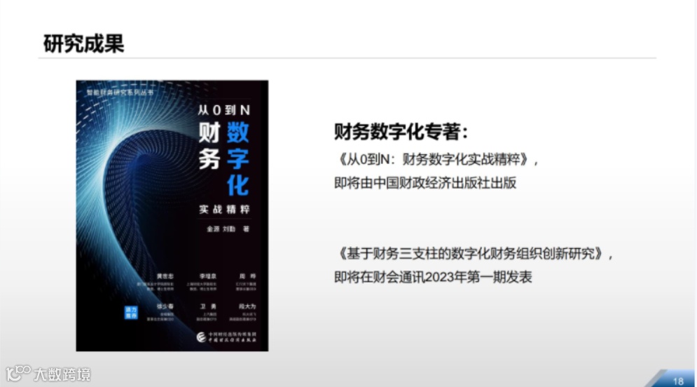 今年,我与上海国家会计学院刘勤教授合著了一本书——《从0到N财务数字化实战精粹》,即将由中国财经经济出版社出版,其中介绍了我们在数字化财务三支柱的创新研究与实践。同时,关于数字化财务三支柱的研究成果也即将在《财会通讯》2023年第一期发表,在这篇论文中,我们非常详细地阐述了数字化财务三支柱体系的创新做法,欢迎大家关注。