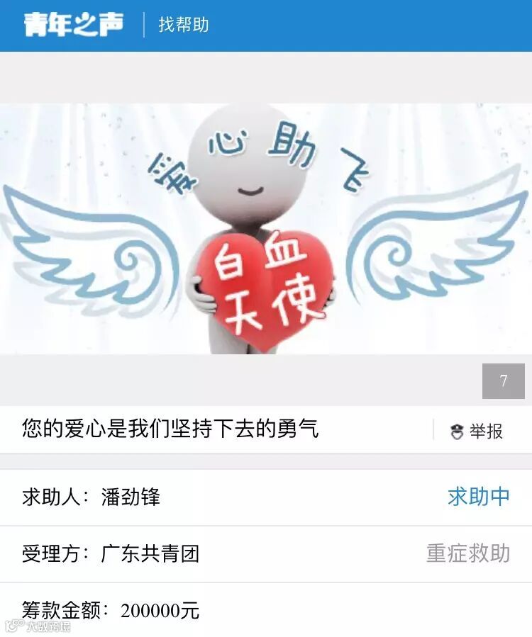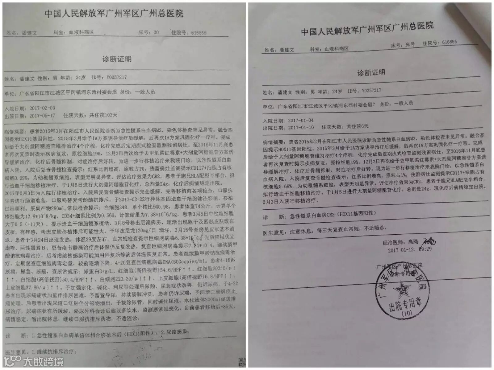 潘建文,25岁,2015年3月不幸患上急性髓系白血病,经过六次化疗病情得到缓解。2016年11月底,白血病再次复发,其先在阳江市做一次化疗,2017年初转院上广州军区总医院做化疗后病情缓解,于2017年2月份做骨髓移植手术。但高额的治疗费用迫使潘家卖掉唯一的房子,花光所有积蓄,入不敷出,负债累累。