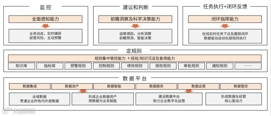企业智能运营中心逐渐成为新型智慧企业建设的核心要素之一,是未来智慧型企业的核心基础设施及载体。在具体的业务经营过程中,企业通过数智运营中心,基于数据发现问题,提出预警并直接驱动采取相应的行动,能够全面推动数据驱动在经营中的功能实现。