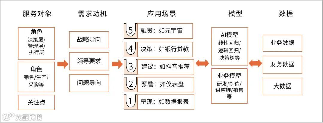 数据驱动的应用场景,实际上对应的是服务对象不断发展的从低到高的需求,层级的高低则是由人机协同的程度来体现。