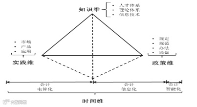 第二,知识维对其它维的影响。即每一个时间段出现的信息技术等知识维度都会制约实践维度的产品功能,如人工智能技术使会计信息化市场出现RPA和智能财务系统等产品;这些知识维度也会加速相关政策的落地,如2008年XBRL中国区组织成立,市场上相关XBRL技术也已成熟,财政部于2011年颁布《关于企业会计准则通用分类标准实施若干标准实施工作的通知》;同时这些知识维度也会影响人才体系的培养内容,如随着“大智移云”技术应用场景的不断落地,全国会计专业学位研究生教育指导委员会建议在人才培养体系中增加云会计与智能财务共享、机器学习与财务智能、大数据挖掘与商业智能等课程。